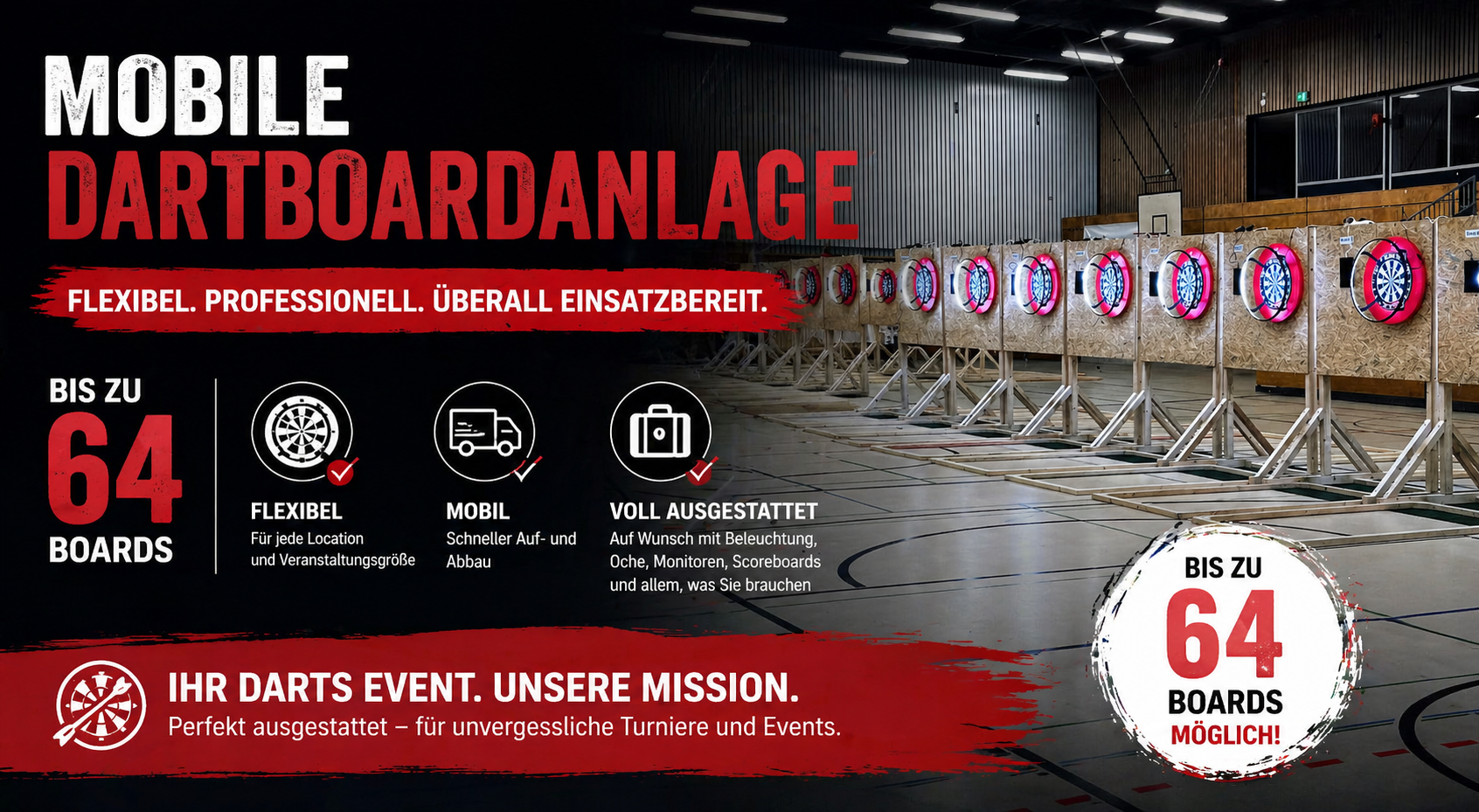 Bei uns könnt Ihr eine mobile Boardanlage mit bis zu 48 Boards, optional mit Beleuchtung und Tablet, für Euer Event, egal ob Turnier, Familien- oder Firmenfeier, mieten.